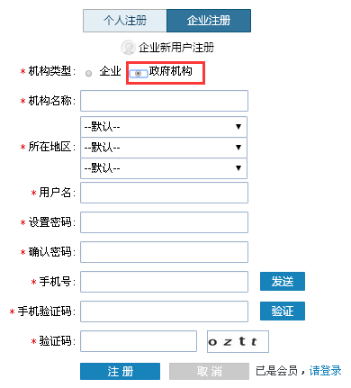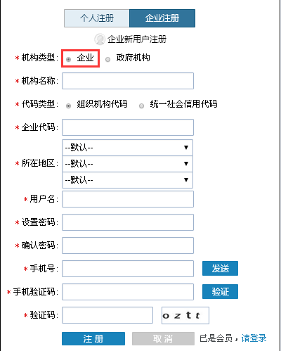 企业版:登陆账号为社会统一信用代码,原始登陆密码为6个0。若系统显示该用户不存在,点击【新用户注册】进行注册。其中新用户注册时注意选择机构类型,如图所示: