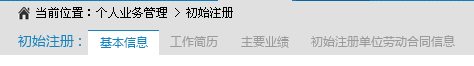 示例:初始注册,点击【个人业务管理-初始注册】,按要求填报基本信息、工作简历、主要业绩、初始注册单位劳动合同信息等内容,如图所示: