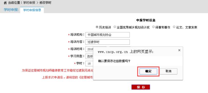2)弹出对话框,按要求填报学时信息,点击【保存】,确认保存数据,如图所示: